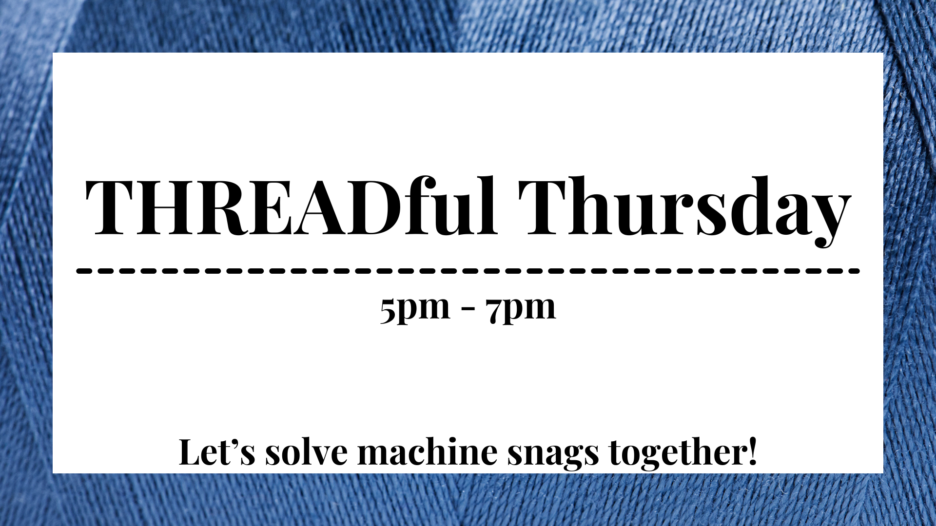 Welcome to "Threadful Thursday" from 5pm to 7pm—an evening dedicated to solving the mysteries of your sewing machine with the help of fellow sewists. If you find yourself tangled in machine troubles, this gathering is your solution! Bring your sewing machine and join us as we troubleshoot and untangle any threading or technical issues together.